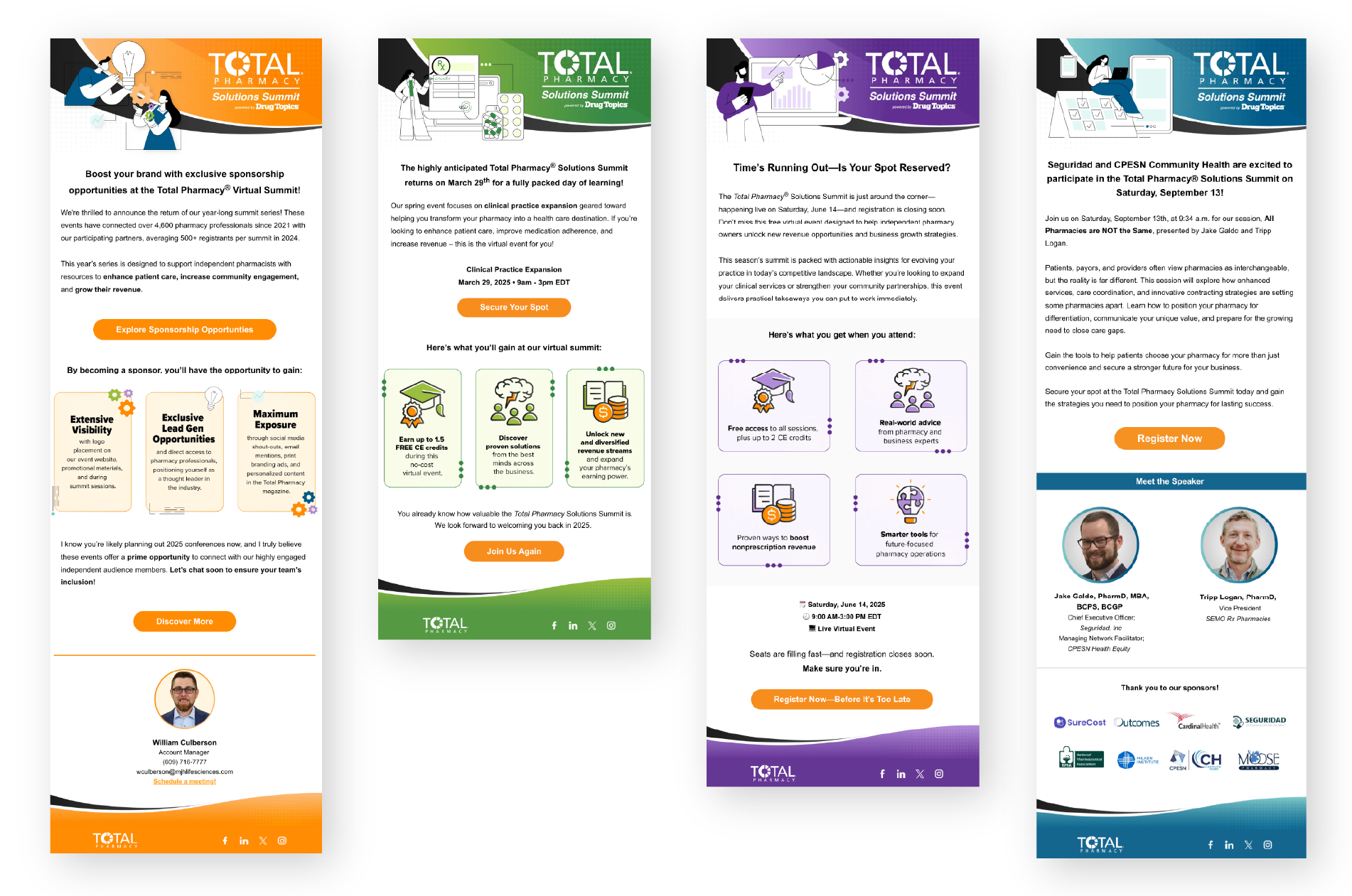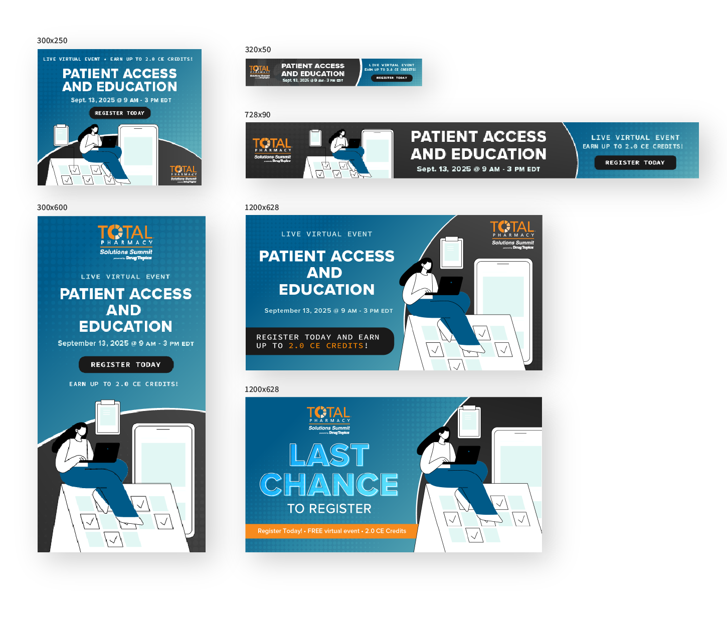 In 2025, I spearheaded the redesign of this continuing education event for pharmacy professionals, producing cohesive visuals across web, social, print, video, and the event webpage. The refreshed identity launched successfully across the spring, summer, fall, and winter programs.